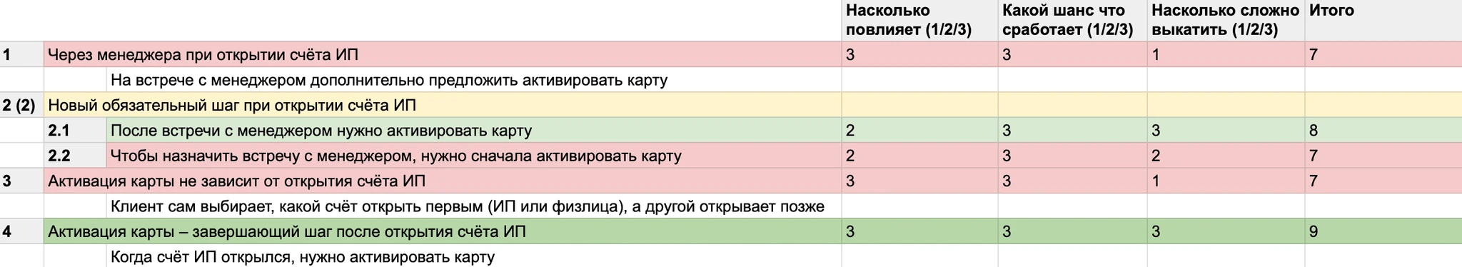 Чтобы устранить проблему системно, прикинули варианты и сравнили их по табличке. Самый рабочий — выпуск карты как завершающий шаг открытия счёта ИП, поэтому протестируем его.